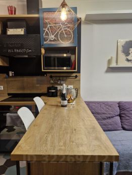 - Кухня-гостиная (большая полноценная рабочая поверхность, индукционная плита, духовка, мирковолновая печь, вместительный холодильник 2 метра, кофеварка, вытяжка, встроенный проточный фильтр для воды "Барьер-эксперт");