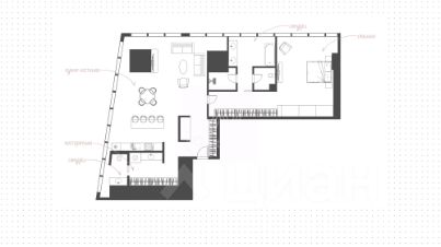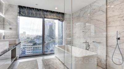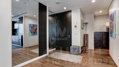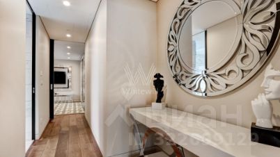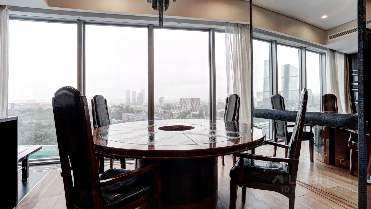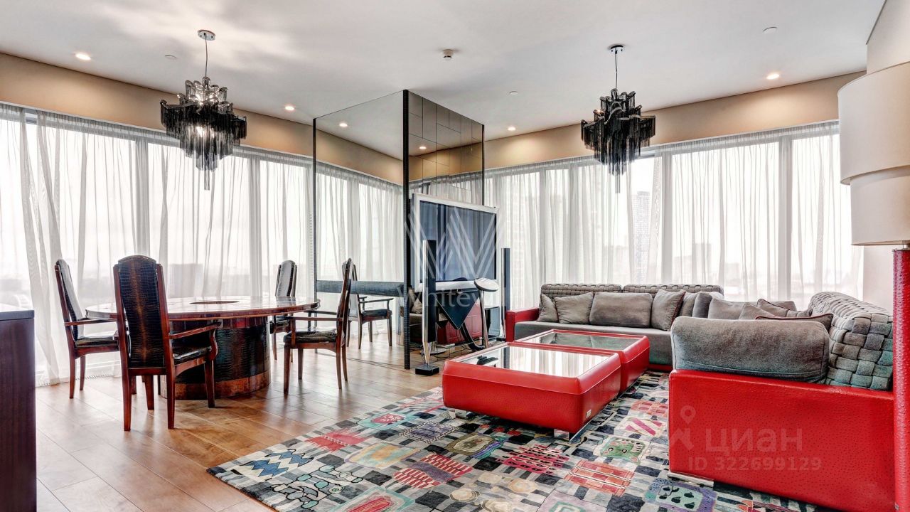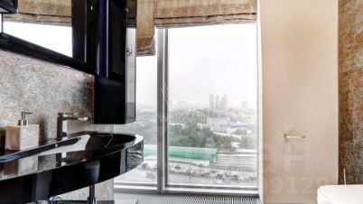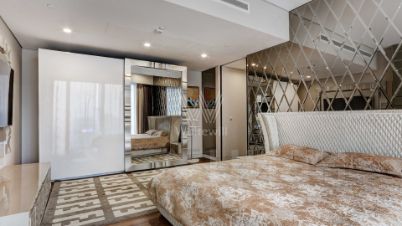 Апартаменты с 1-й спальней общей площадью 110 м² в башне "ОКО Towers" на 13 этаже. Выполнен дизайнерский ремонт в светлых тонах. В отделке использовано натуральное дерево, камень и стекло. На полу выложен паркет, стены украшены картинами и зеркальными панно. Ванная комната отделана белым мрамором.