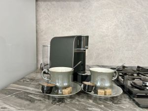 оборудованная кухня с необходимым набором кастрюль, посуды и столовых приборов ( холодильник, микроволновая печь, плита, посудомойка, духовой шкаф, чайник, кофе-машина , стационарный фильтр для воды)