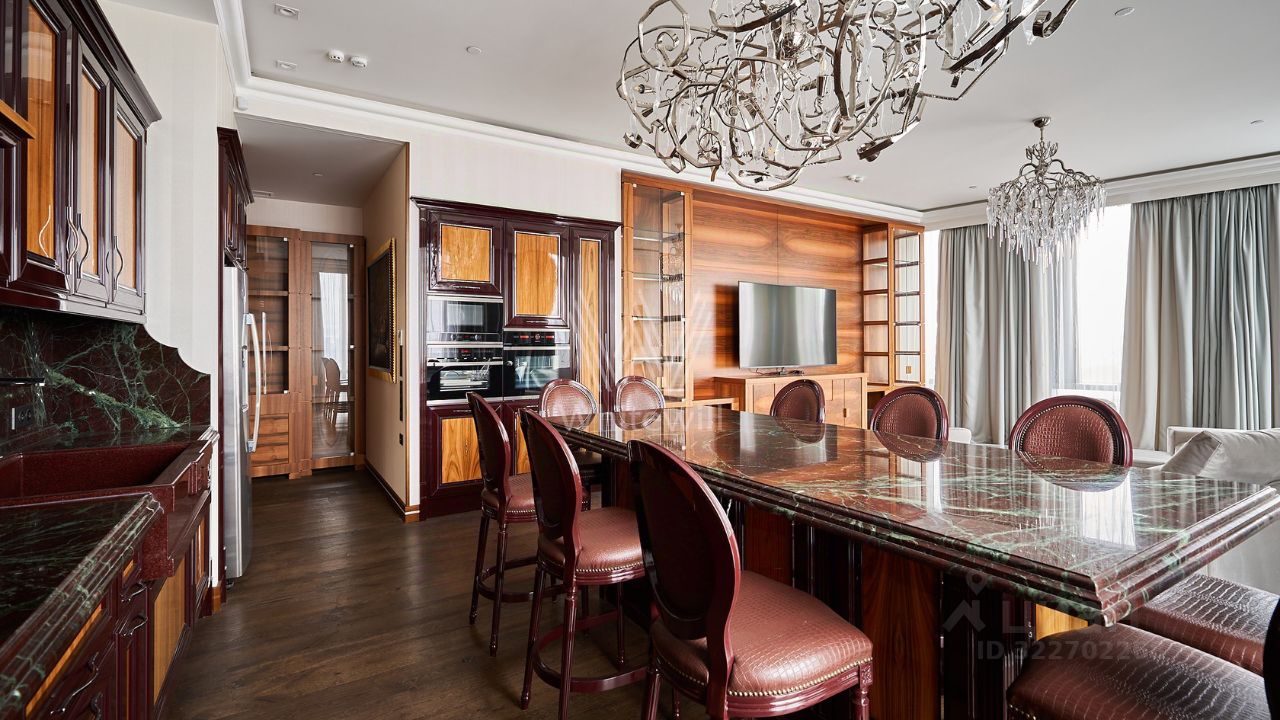 На полу выложена шведская дубовая паркетная доска, межкомнатные двери из массива красного дерева Анегри, потолок в спальне украшает люстра из венецианского стекла. Квартира укомплектована мебелью из США и Великобритании и оборудована бытовой техникой Kuppersbusch и Miele. Установлены система бесшумного кондиционирования Daikin, подогрев полов, электрокарнизы, системы антипротечки и пожаротушения, охранная сигнализация и усилитель сотовой связи. По периметру квартиры выполнена гидроизоляция.