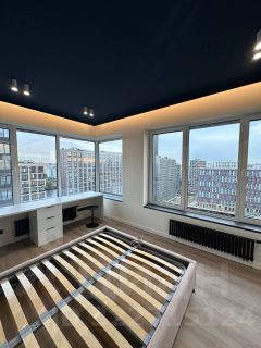 Много сценариев освещения и мест для хранения. В большой спальне стоят рабочий стол и кресла для двоих. Есть зона для макияжа — большое поворотное зеркало с подсветкой. Вторая спальня со встроенным шкафом: может стать детской или кабинетом по желанию.