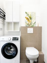 - Светлая ванная комната с современной техникой.