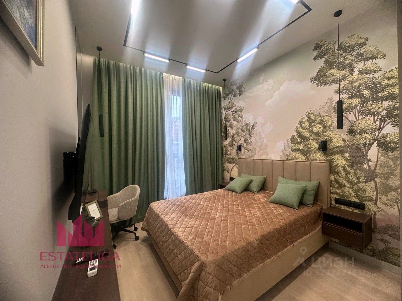В спальне кровать с матрасом Dreamline серия massage, вместительный встроенный шкаф и дополнительное рабочее место.