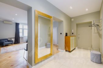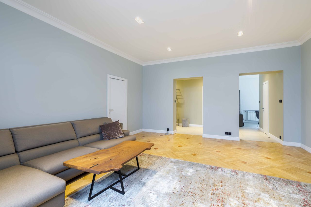 Вашему вниманию предлагается просторная четырехкомнатная квартира в сталинском доме. Окна выходят на обе стороны, что обеспечивает естественное освещение в течение всего дня. Во дворе всегда есть парковочные места — въезд осуществляется через шлагбаум.