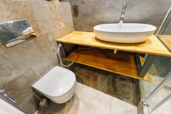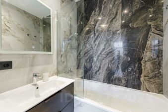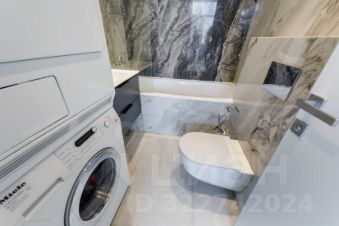 Ванна, унитаз, стиральная и сушильная машины MIELE, тумба с раковиной KERAMA MARAZZI, зеркало с подсветкой, бойлер.