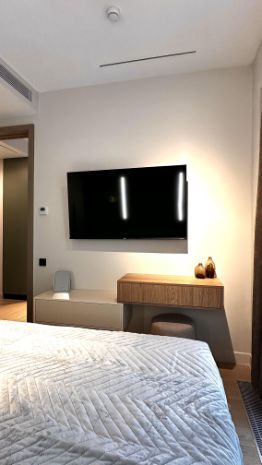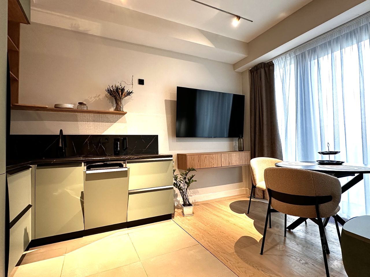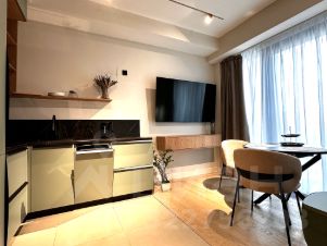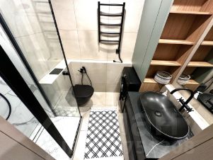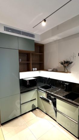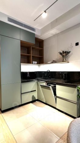 В квартире сделан качественный евроремонт. Комната и кухня полностью меблированы, поэтому можно сразу заехать и жить. Из техники есть всё необходимое: кондиционер, холодильник, посудомоечная машина, телевизор и стиральная машина. В ванной комнате установлена удобная душевая кабина.