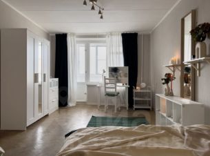 Интерьер выполнен в светлых тонах, с тёплыми акцентами и продуманной планировкой.