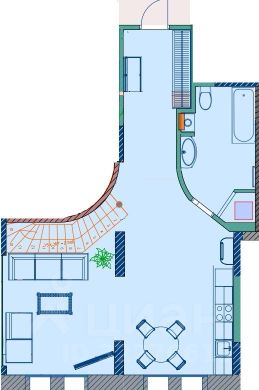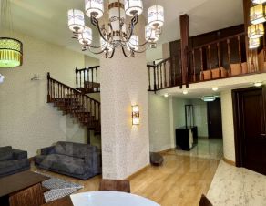 Кухня с необходимой техникой (духовка, микроволновка, посудомоечная машина, холодильник, плита с 4 конфорками), гостиная оснащенная мебелью и ТВ, с/у совмещенный, имеется душевая, ванная, унитаз Toto). Спальня с гордеробной располагается на втором ярусе. В апартаментах на полу в гостиной и спальне доска из натурального дуба, в других помещениях мраморная плитка. Имеется кондиционер и приточно-вытяжная вентиляция, есть интернет.