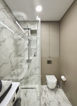 - Санузел с большой душевой, удобной раковиной и современной сантехникой.