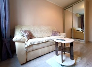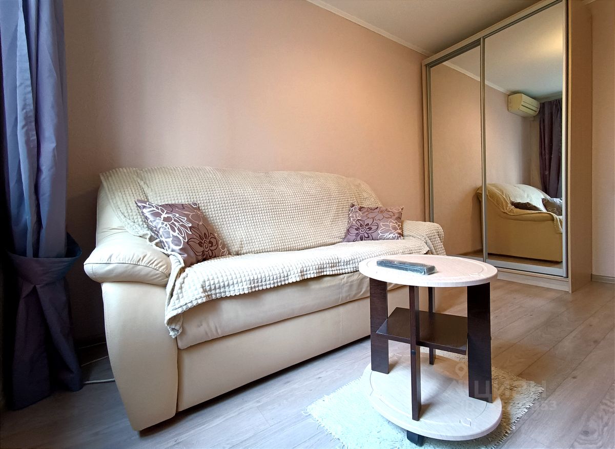 В комнате находятся раскладной диван, шкафкупе, журнальный столик и телевизор. Санузел совмещенный. на кухне есть холодильник, стиральная машина, микроволновка, электрический чайник, кофемашина.