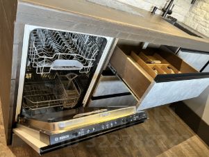 В ремонте использован массив сосны для каркасных деталей и массив ясеня для столешниц (только фасады из МДФ, все остальное массив дерева!)
