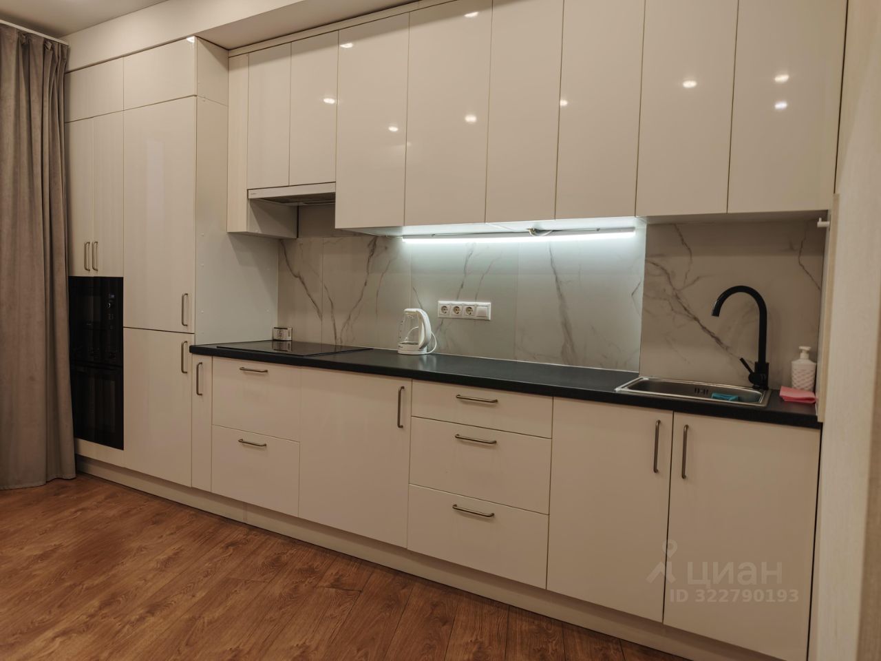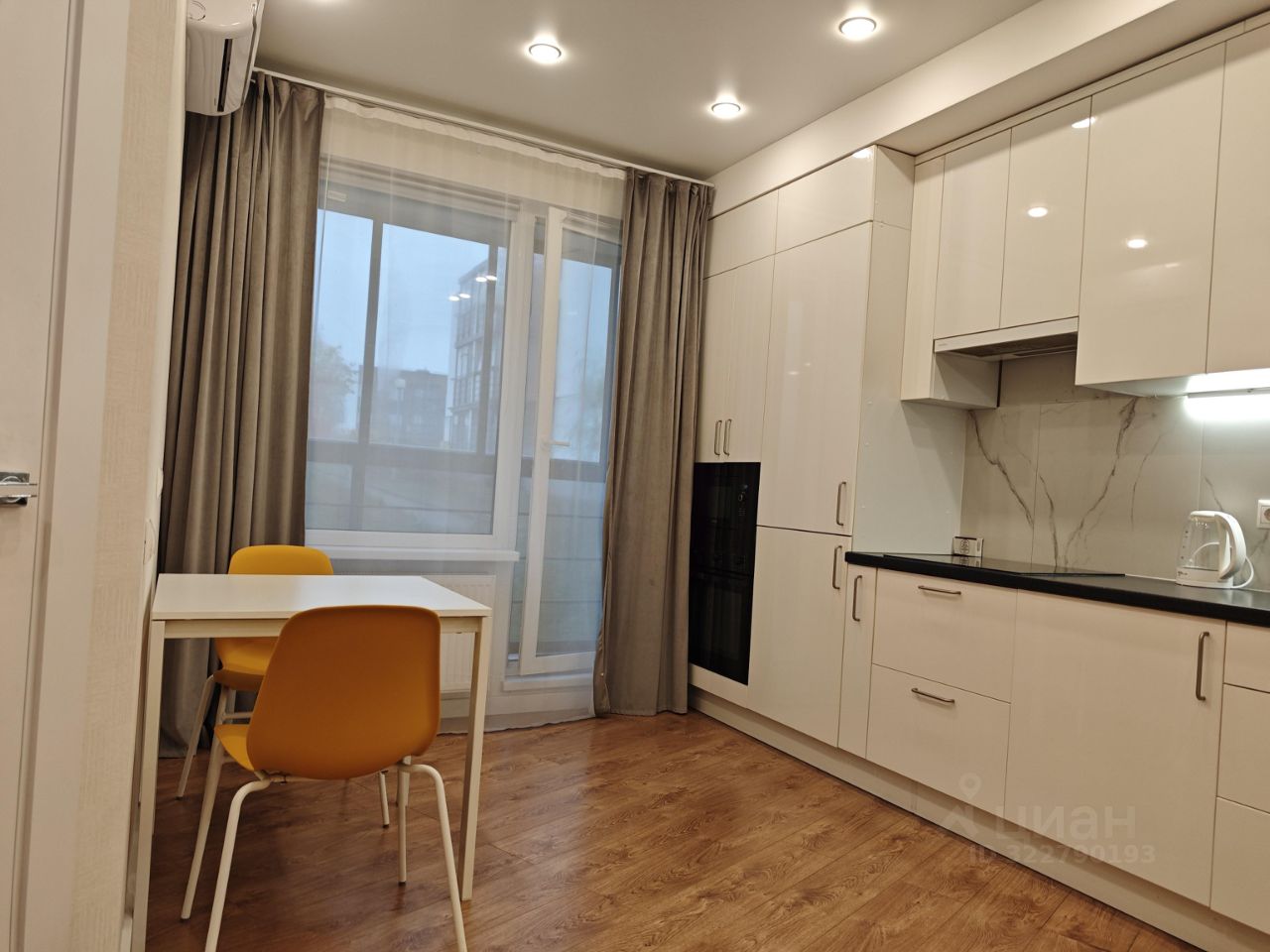 Квартира в формате евродвушка: отдельной спальней с дверью, гостиной совмещеной с кухонной зоной.