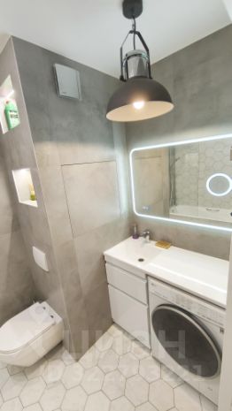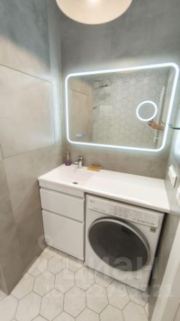 Санузел с большой ванной, большой раковиной и зеркалом с подсветкой, оборудованный новой сантехникой, подвесным унитазом и современной стиральной машиной с сушкой.