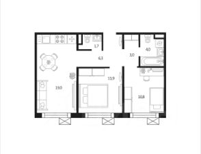 В квартире большая кухня-гостиная 19м, спальня 12м, кабинет или детская 11м, ванная с туалетом 4м и отдельный санузел 2м.