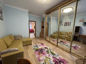 В комнатах и на кухне есть вся необходимая мебель для комфортного проживания. К вашим услугам современная техника: кондиционер, холодильник, телевизор и стиральная машина. Ванная комната оборудована ванной, что позволит расслабиться после долгого дня. Окна выходят во двор, поэтому в квартире тихо и спокойно.