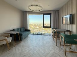 Панорамные окна, гостиная с кухонной зоной, изолированная спальня, гардеробная, постирочная.