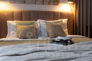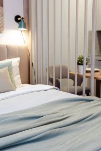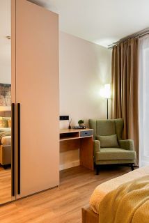 Большая кровать с удобным ортопедическим матрасом. Уютное кресло с торшером.
