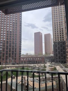 Французский балкон и большое окно. Закрытый двор с детскими площадками.