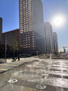 Во дворе продуктовый магазин. Рядом много кафе и магазинов.