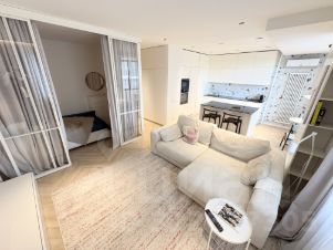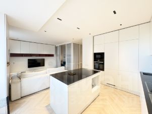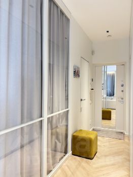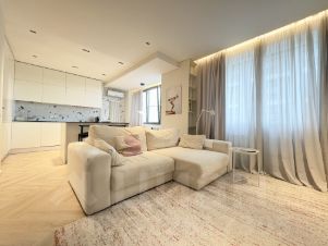 Современный ремонт в светлых тонах, по проекту известного архитектора. Ремонт изначально делали не на продажу и не для аренды, а для себя. О квартире написана статья в известном издательстве, как об одной из самой стильной и функциональной, комфортной квартире. В квартире кухня-гостиная и отдельно за стеклянными витражными перегородками спальня, но фото хорошо видно. Множество мест хранения. Санузел с ванной. Гардеробная. Кондиционер. В санузле также есть вместительный шкаф. Сантехника: Jacob delafon, ideal Standart. На кухне : смеситель Grohe, мойка OMOIKIRI. Микроволновка, духовка Bosch. Варочная панель, посудомойка Electrolux. Гриль SMEG. Холодильник LIEBHER. Мебель Mr doors, кухня Scavolini. Столешница кварц. Светильники итальянские светодиодные FLOS, Vibia. Потолки гипсокартон с шумоизоляцией. Красивый вид из окна.