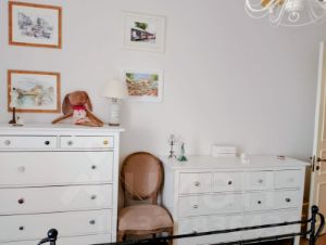 - Светлые стены, белая мебель, на полу - паркетная доска