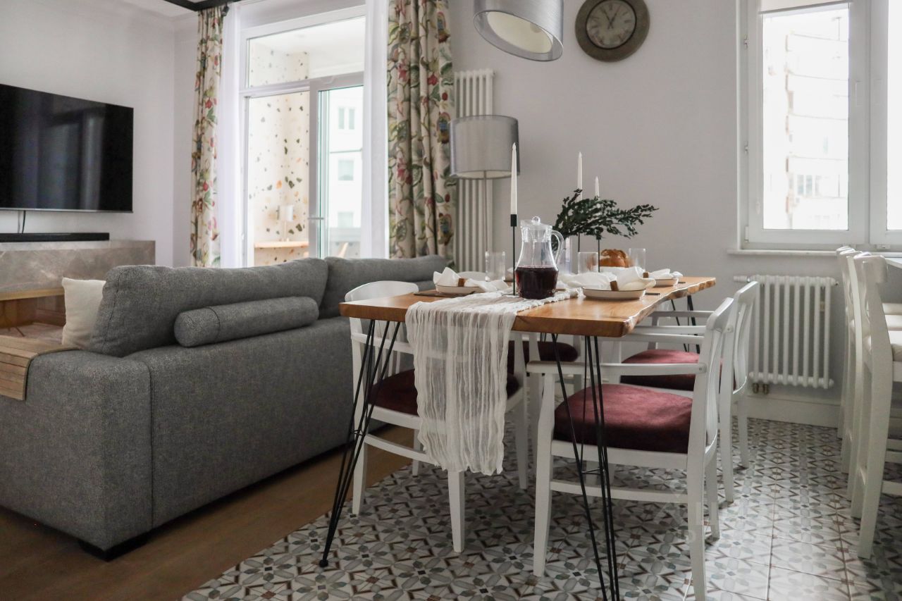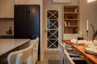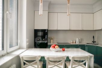 Вас будут окружать лоск и только качественные материалы: паркетная доска, керамогранит, мраморные подоконники, столешница кухни и острова из кварцита, высокие двери из массива дуба. Шикарный обеденный стол, рабочий стол и полки на балконе из массива дуба с живым краем.