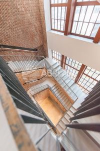 Между 1 и 2 уровнем сделана парящая лестница со стеклянным ограждением.
