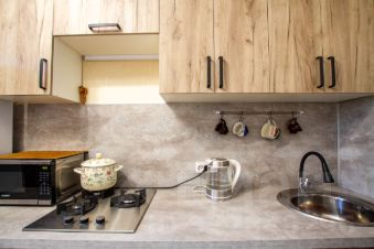 В квартире имеется вся необходимая мебель и техника: кухонный гарнитур, холодильник, печь-СВЧ, газовая плита, компактная электрическая духовка, вытяжка, стиральная машина, пылесос. В комнате удобная двуспальная кровать, раскладной диван, телевизор, комод, платяной шкаф, кондиционер.
