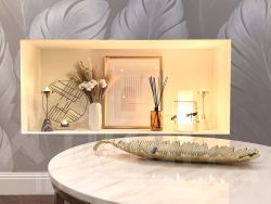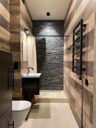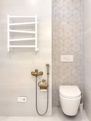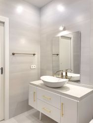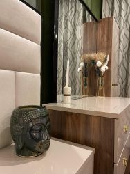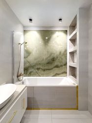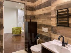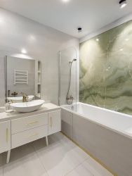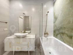 В квартире две ванные комнаты: одна с ванной, другая с душевой кабиной. Полы в обеих оборудованы подогревом, а основная ванная дополнительно украшена стеной из натурального зелёного оникса.