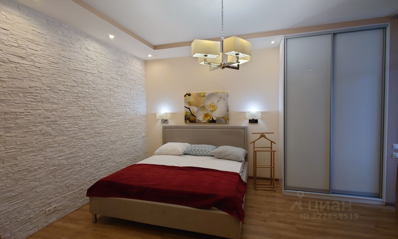В комнате: двуспальная кровать, шкаф-купе для одежды, напольная тумба и настенная современная полка, Кондиционер, напольное зеркало,