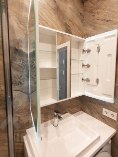 Квартира впечатляет стильным дизайнерским ремонтом и продуманной обстановкой. Высокие потолки и панорамные окна, выходящие во двор, создают атмосферу простора и света.