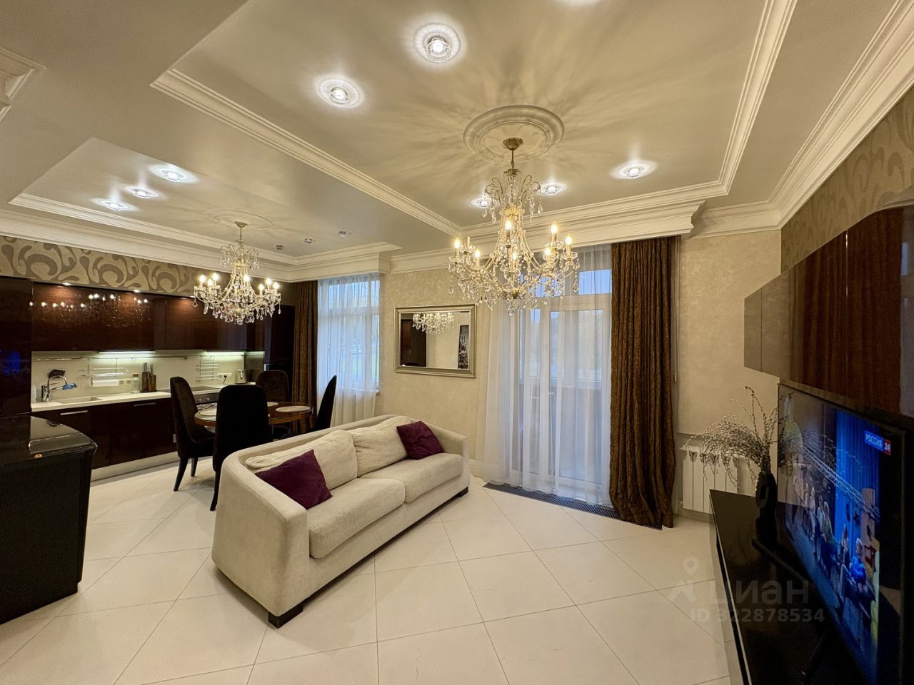 Встроенная кухня с техникой BOSCH- посудомоечная машина, варочная панель и духовой шкаф, встроенный холодильник с морозильным отсеком, фильтр для воды с системой обратного осмоса, измельчитель пищевых отходов, микроволновая печь. Круглый обеденный стол со стульями, мягкий диван и большой телевизор.