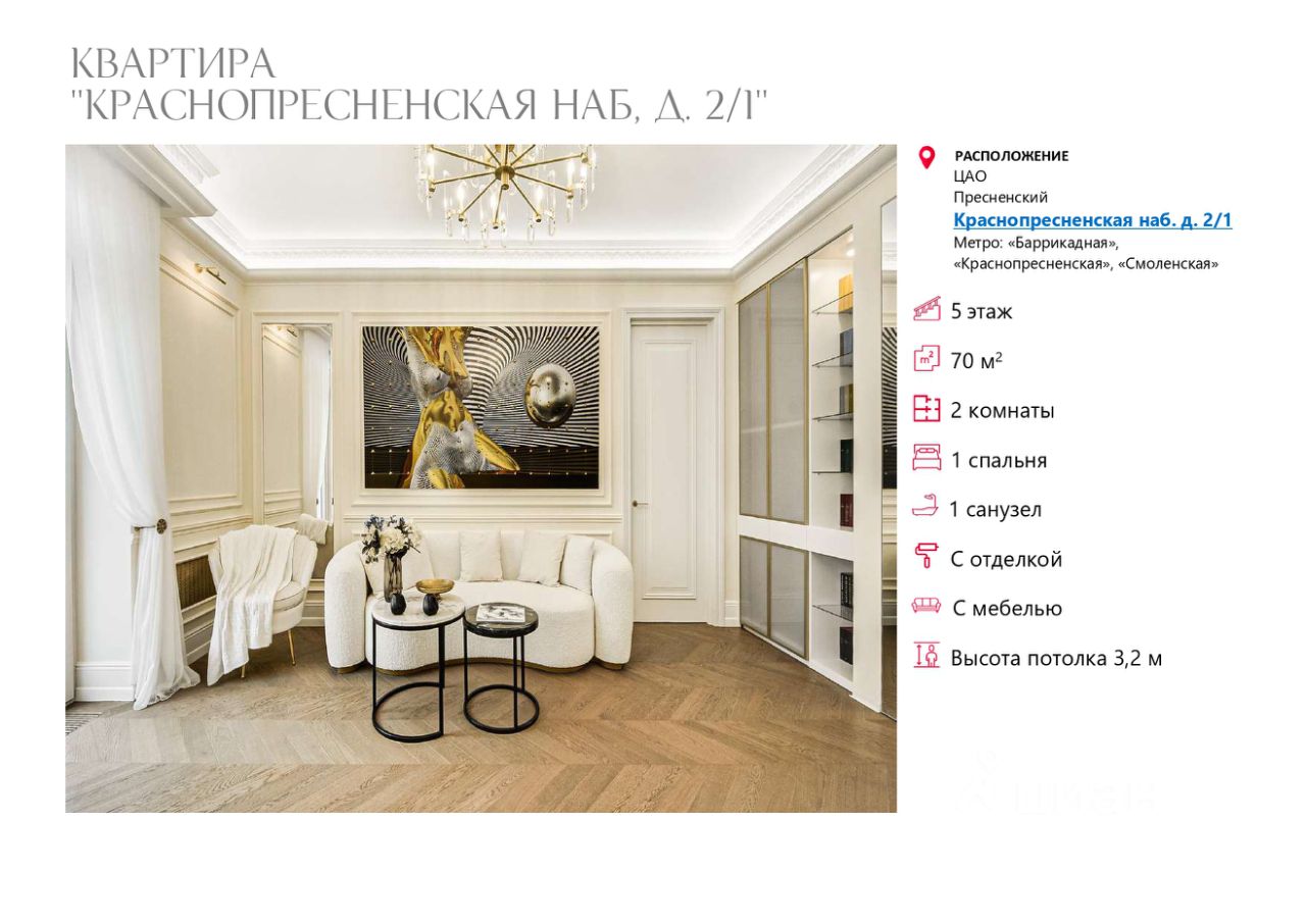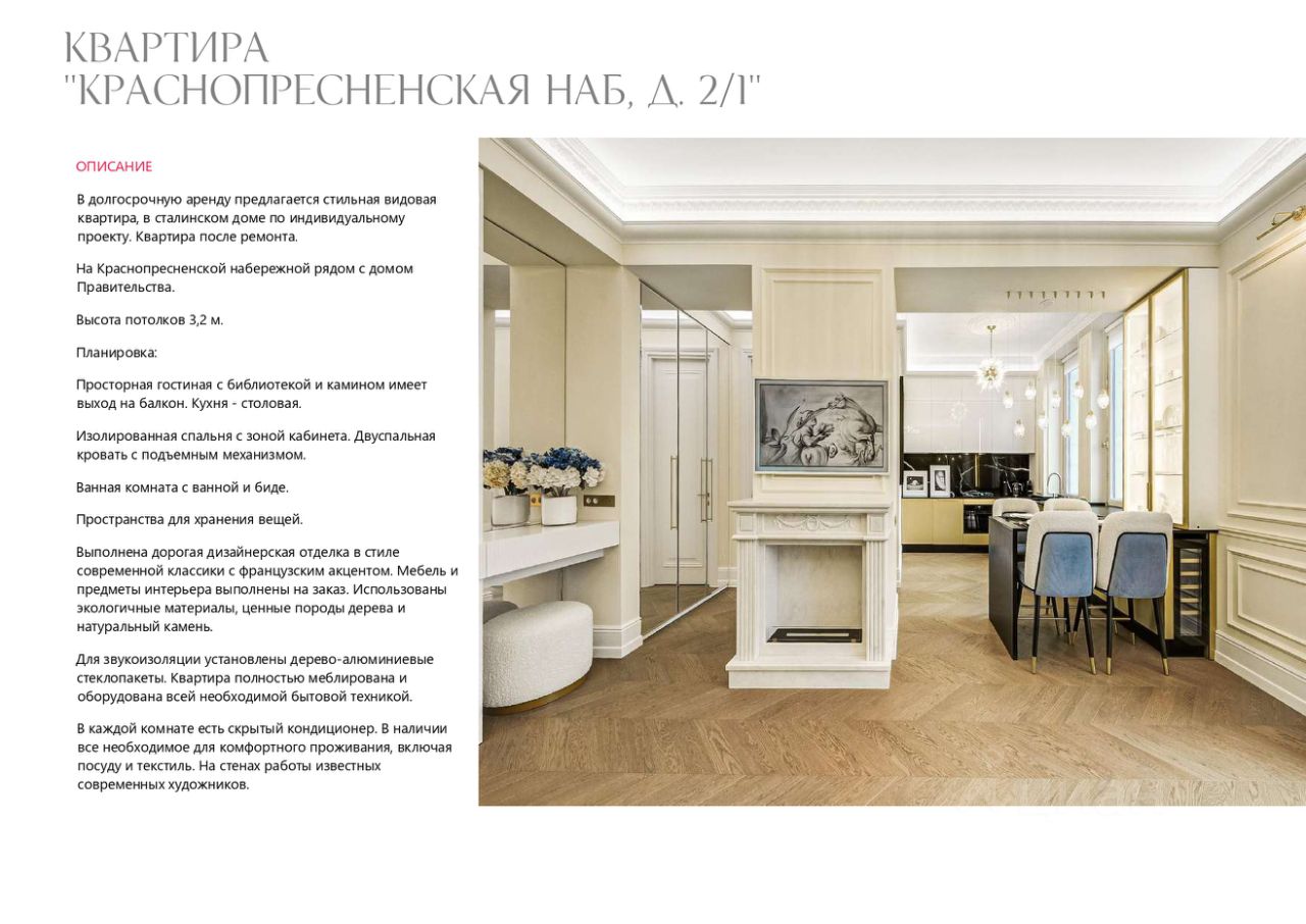 В долгосрочную аренду предлагается стильная видовая квартира, готовая к комфортному проживанию в фасадном сталинском доме на Краснопресненской набережной, рядом с Домом Правительства.