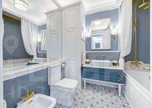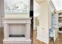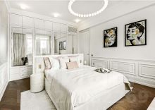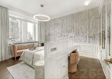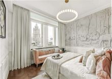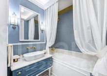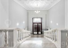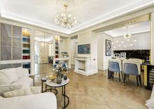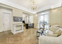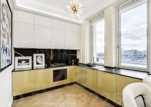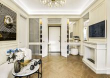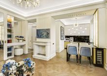 Выполнена дорогая дизайнерская отделка в стиле современная классика с французским акцентом. Использованы экологичные материалы, ценные породы дерева, латунь и натуральный камень, для звукоизоляции установлены дерево-алюминиевые стеклопакеты.