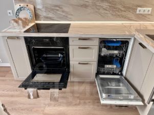 Новая кухня, включающая холодильник, варочную панель, вытяжку, духовой шкаф, СВЧ, посудомойку, эл.чайник, посуду.