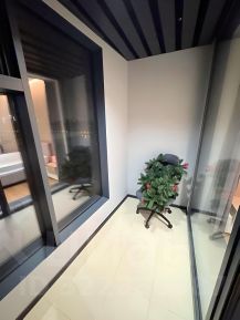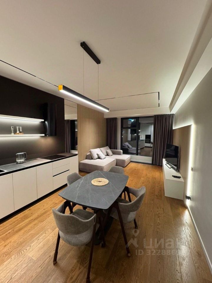 Общая площадь квартиры — 60 м². Продуманная планировка, высокие потолки 3 метра и панорамные окна наполняют пространство светом и воздухом, создавая ощущение простора и лёгкости.