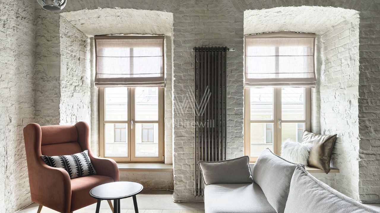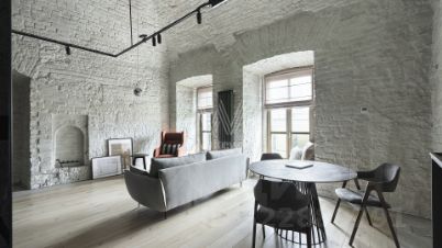 Бонус партнёрам 50%. Двухуровневая квартира. Главный акцент в отделке квартиры — старинная белая кирпичная кладка с клеймами. Архитекторы вручную "открыли" кирпич, сохранив поверхность с фактурой, вставками и кладками разных эпох. В отделке использованы ценные породы дерева — дуб, сосна. Натуральный камень сочетается с гидравлической лавой и гидратированной известью.