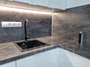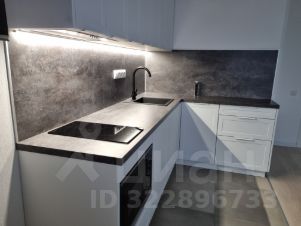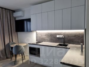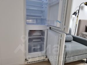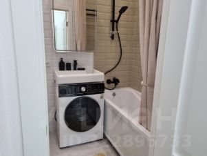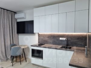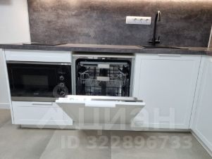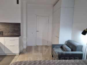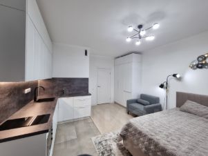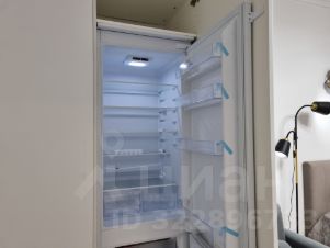 Зона кухонной плиты оборудована эффективной вытяжкой, что актуально для студий. Предусмотрено местное освещение кухонного стола. Установлена посудомоечная машина.