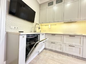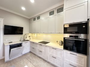 Встроенный кухонный гарнитур, индукционная варочная панель, посудомоечная машина, измельчитель, духовой шкаф, микроволновка, двухкамерный холодильник. Удобный кухонный стол, стулья. Установлена система защиты от протечки воды. Мощный проточный водонагреватель, фильтры мягкой очистки воды. Кондиционеры премиального качества.