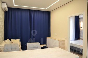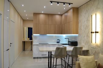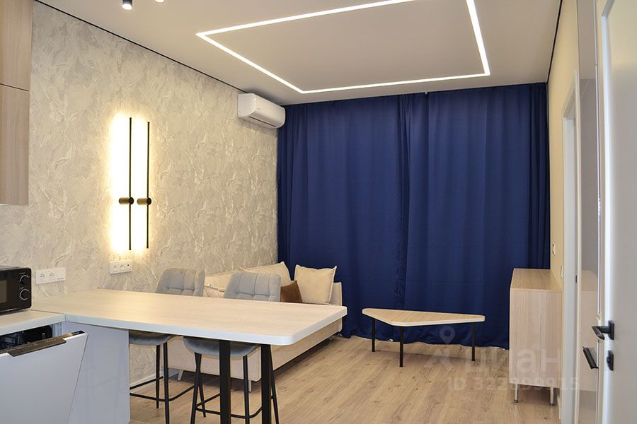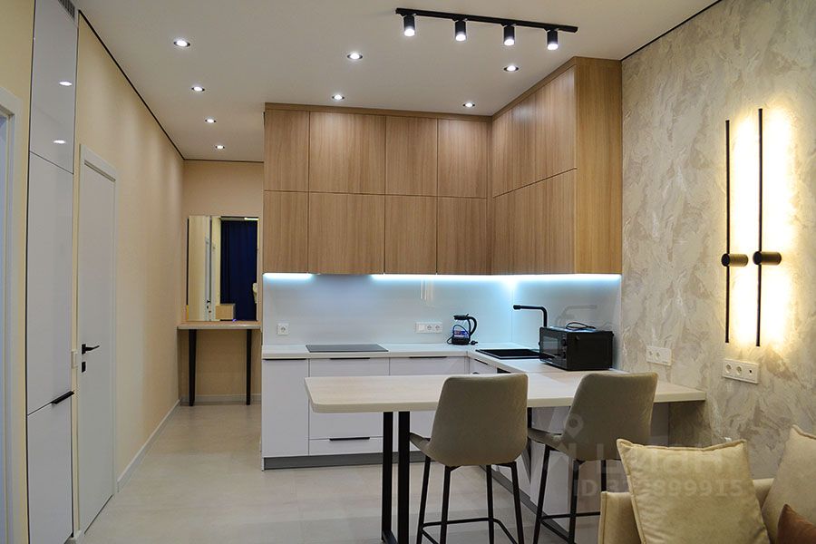 Только что окончен высококачественный евро-ремонт (в квартире никто не жил). Кухня-гостиная и изолированная спальня. Новая мебель и техника: кухонный гарнитур, раскладывающийся диван, обеденный и журнальные столы, широкая двуспальная кровать, вместительная система хранения со встроенными шкафами. 2 кондиционера, посудомоечная и стиральная машины, варочная панель, большой холодильник встроенный в стену и вся необходимая мелкая бытовая техника.