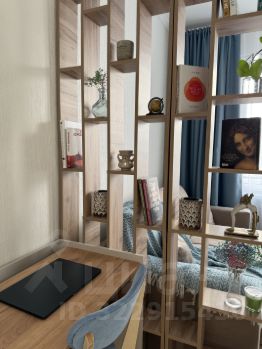 Зона отдыха и сна отделена стеллажом, за которым располагается раскладной диван с ящиком для хранения. Новые подушки, одеяло и наматрасник уже закуплены.