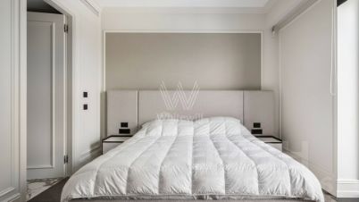 Светлый интерьер оформлен в современном стиле. Спланирована просторная кухня-гостиная, мастер-спальня со своей ванной комнатой, вторая спальня, санузел с душем, холл. Апартамент полностью укомплектован мягкой мебелью, кухня оснащена бытовой техникой.