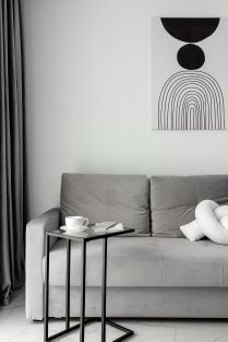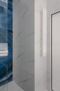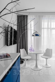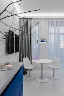 - В невероятно красивой студии Индиго продуманна эргономика, в зонировании применен цветовой эффект объем в объеме, двери скрытого монтажа, множество зеркал, расширяющих пространство.