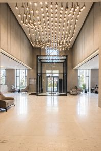 Архитектура зданий в стиле Ар-Деко с фасадами из натурального камня. "Эмоциональная" архитектурная подсветка создает особенную атмосферу вечерами.