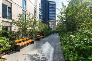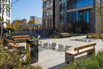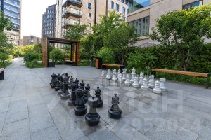 - благоустроенная территория с вишневым садом с беседками и фонтанами, спортивная площадка, уличная шахматная доска, большая и малая детские площадки, выход в парк;
