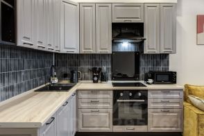- Полностью оборудованная кухня: варочная панель, духовка, микроволновка, чайник, холодильник, посудомоечная машина, полный набор посуды для готовки и сервировки.
