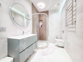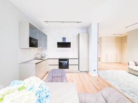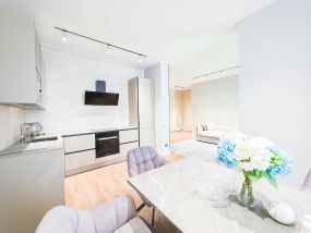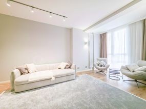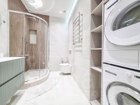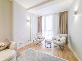 В квартире новый, современный ремонт в теплых постельных тонах. Повсеместно плитка с функцией подогрева. Есть все необходимое для проживания мебель и техника от известных проверенных брендов, качественная немецкая сантехника. Высокие потолки, керамические батареи отопления, кондиционер, сушильная машина. В квартире один сан узел, гардеробная. Все в отличном состоянии, новое. Показы и заселение оперативные.