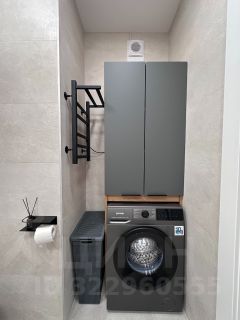 - стиральная машина, электрический полотенцесушитель, шкаф для хранения, большое зеркало, короб для белья