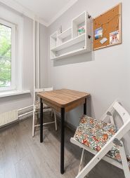 Балкон не застеклен, есть два стула и столик, чтобы в теплую погоду завтракать/пить кофе.