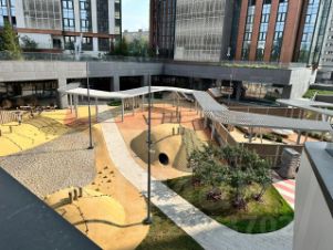 Закрытый внутренний многоуровневый двор с детскими площадками и местами для отдыха (верхний уровень для досуга взрослых, есть места для спорта и отдыха).